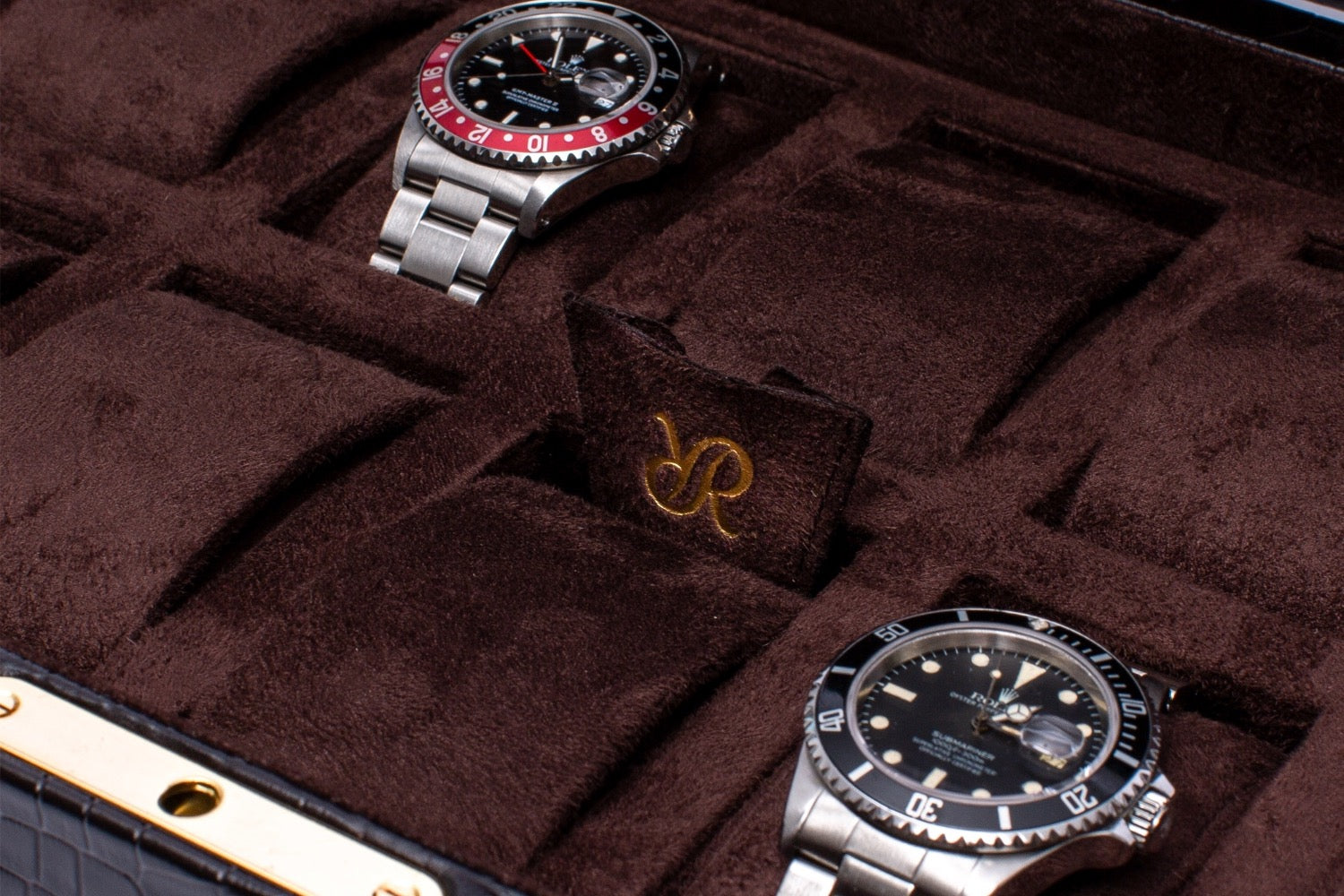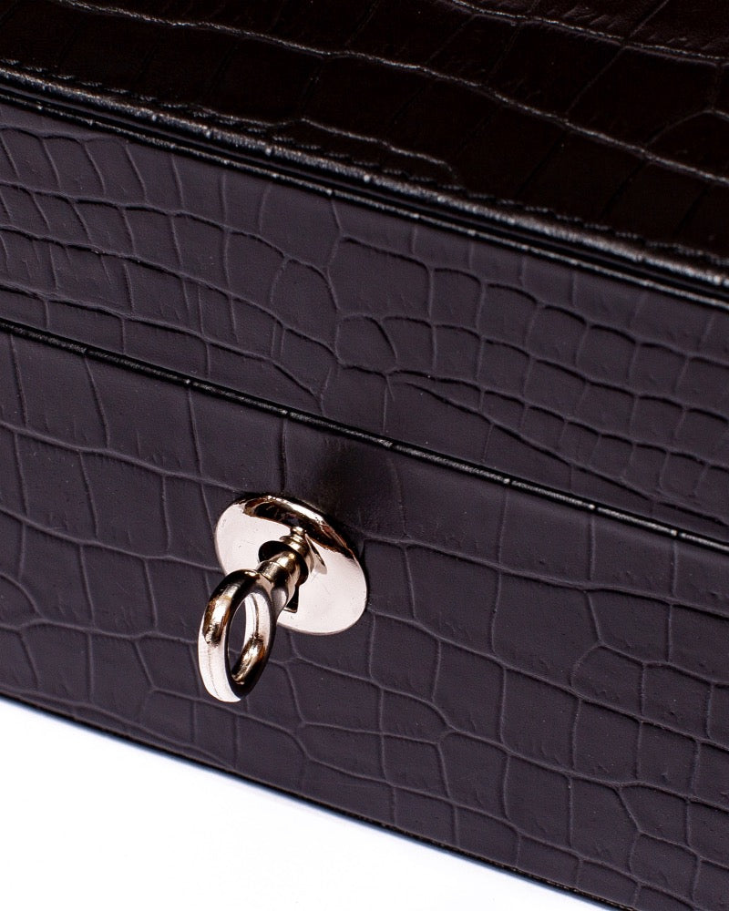 Beautifully hand crafted in solid wood with finest printed crocodile pattern leather, this Brompton watch box can hold up to ten of your finest watches.