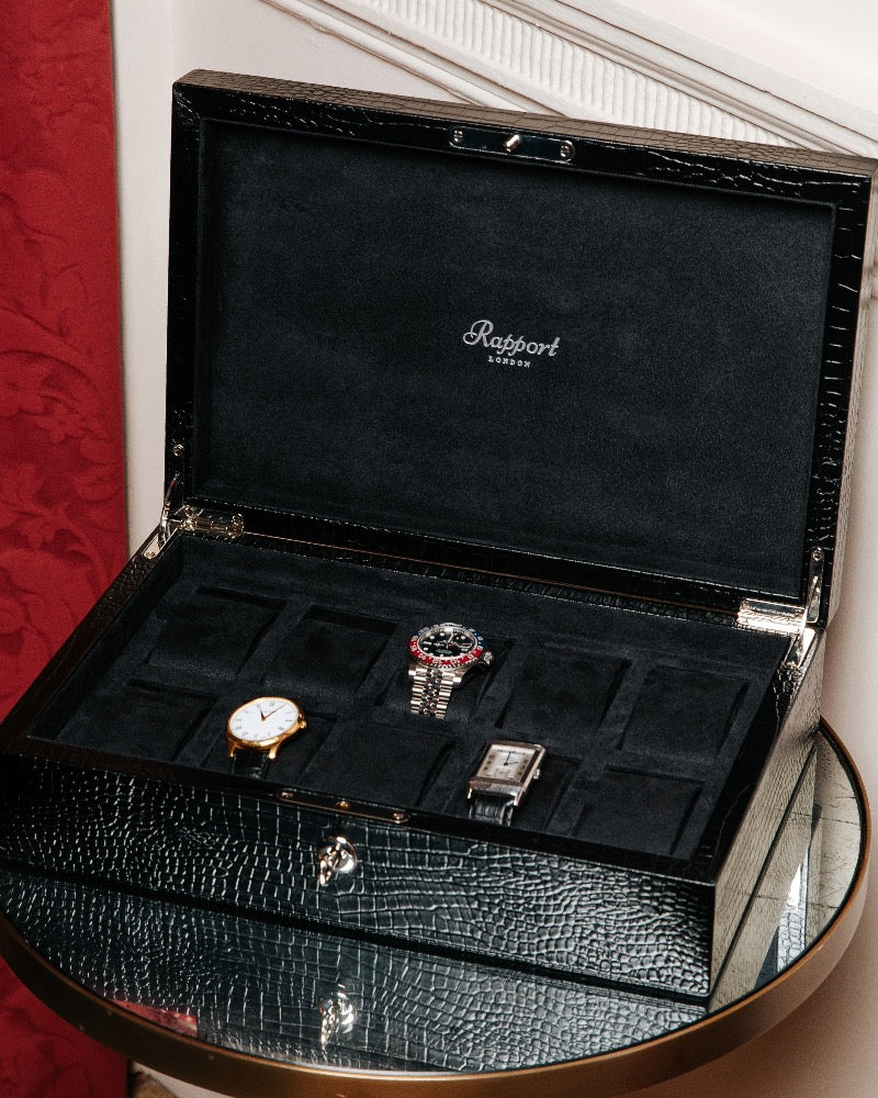 - Rapport sources the finest leathers, woods, and gold-plated fastenings.