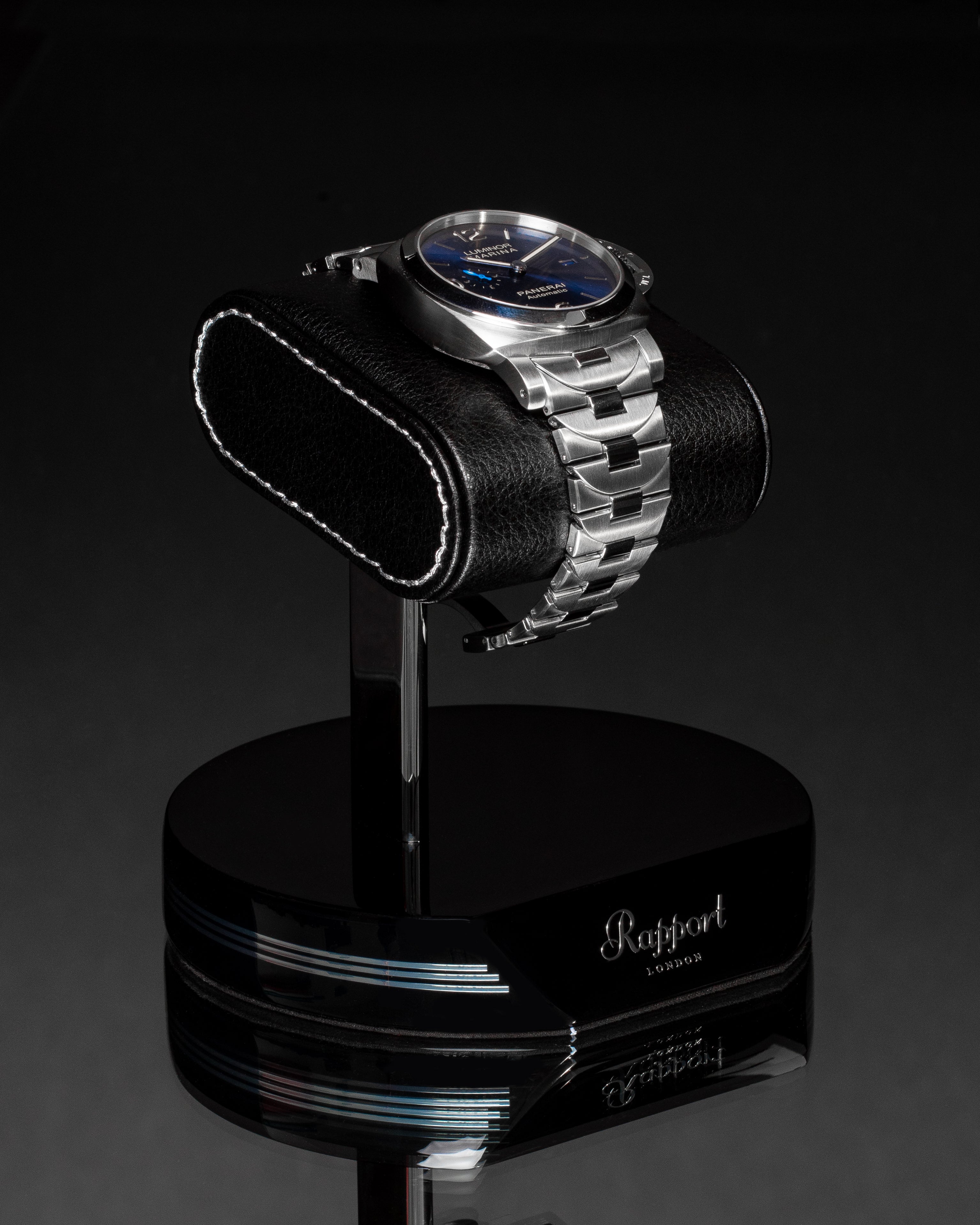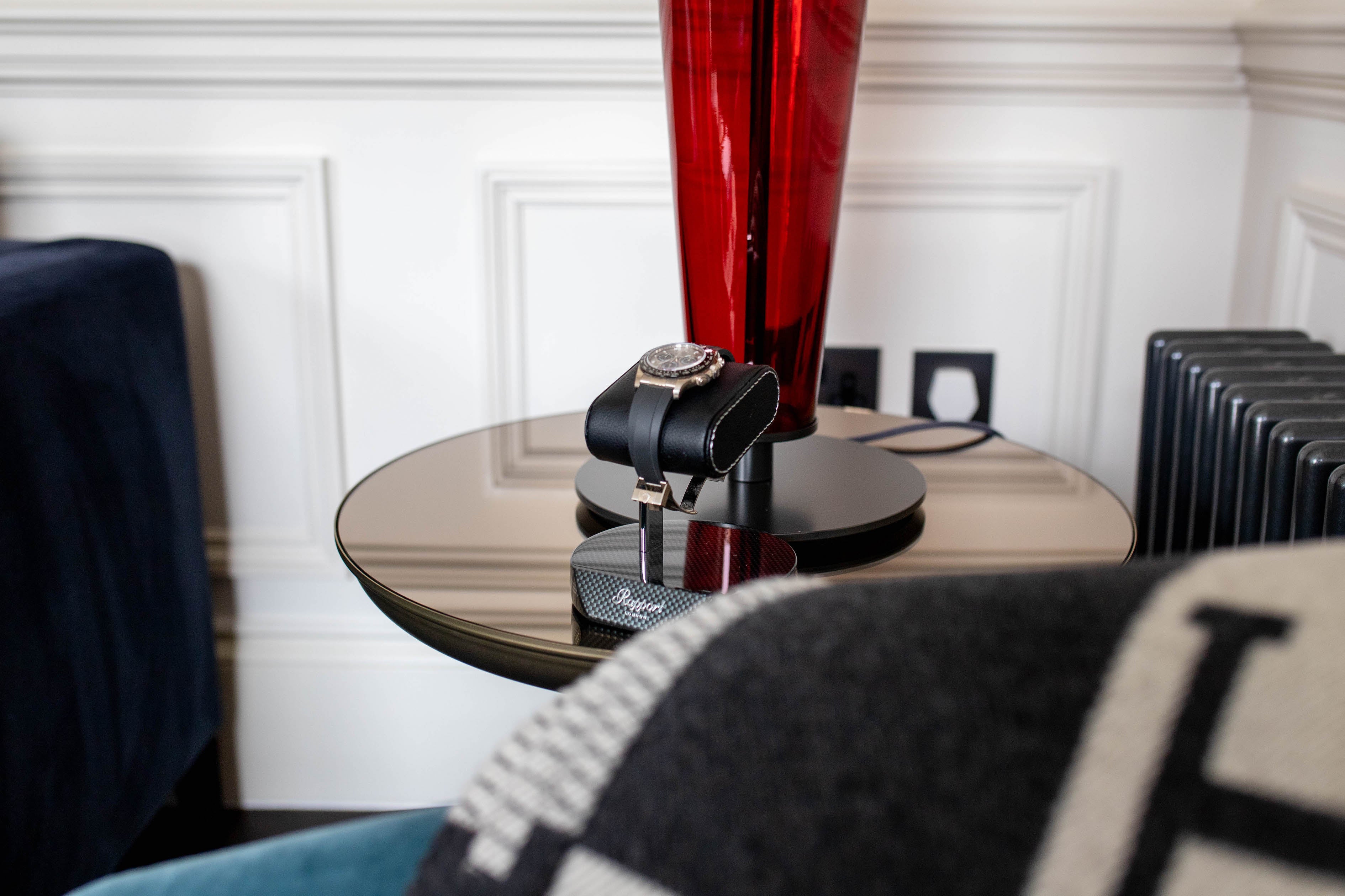 涂漆高光底座支撑着皮革垫,可确保您的手表保持良好状态,而手表支架则为其周围环境增添了精致的装饰感。