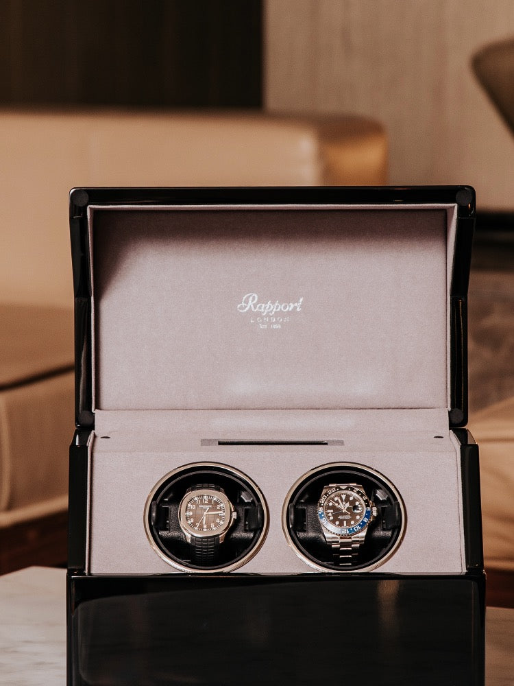 Perpetua Duo 手表上链器采用优质木材制成,并带有奢华的手工涂漆饰面,具有一定的古典魅力,可与任何装饰相得益彰。 Duo Watch Winder 的内部覆盖着柔软的天鹅绒,配有两个带橡胶夹的皮革软表垫,可以调节以适应各种表带尺寸和款式。