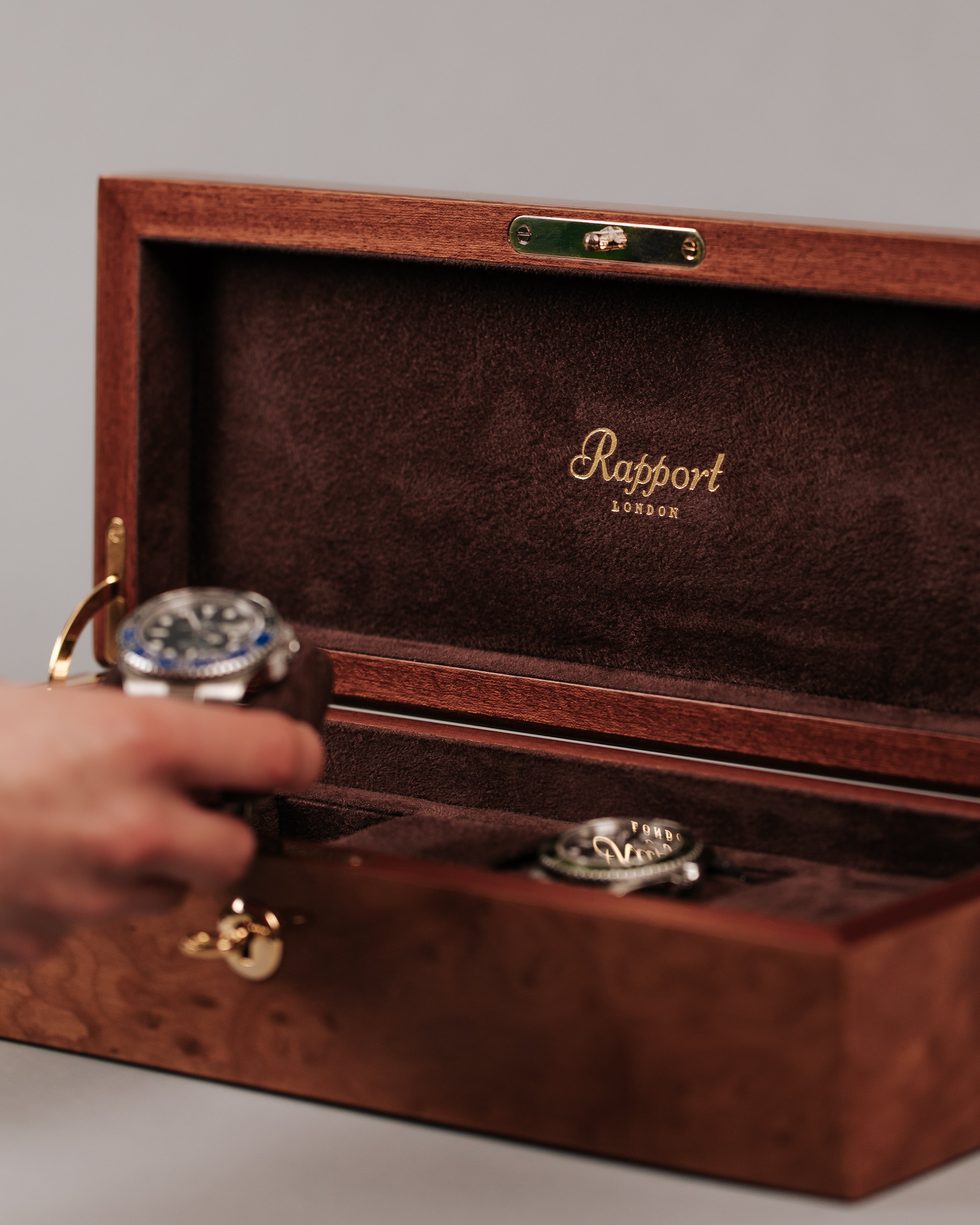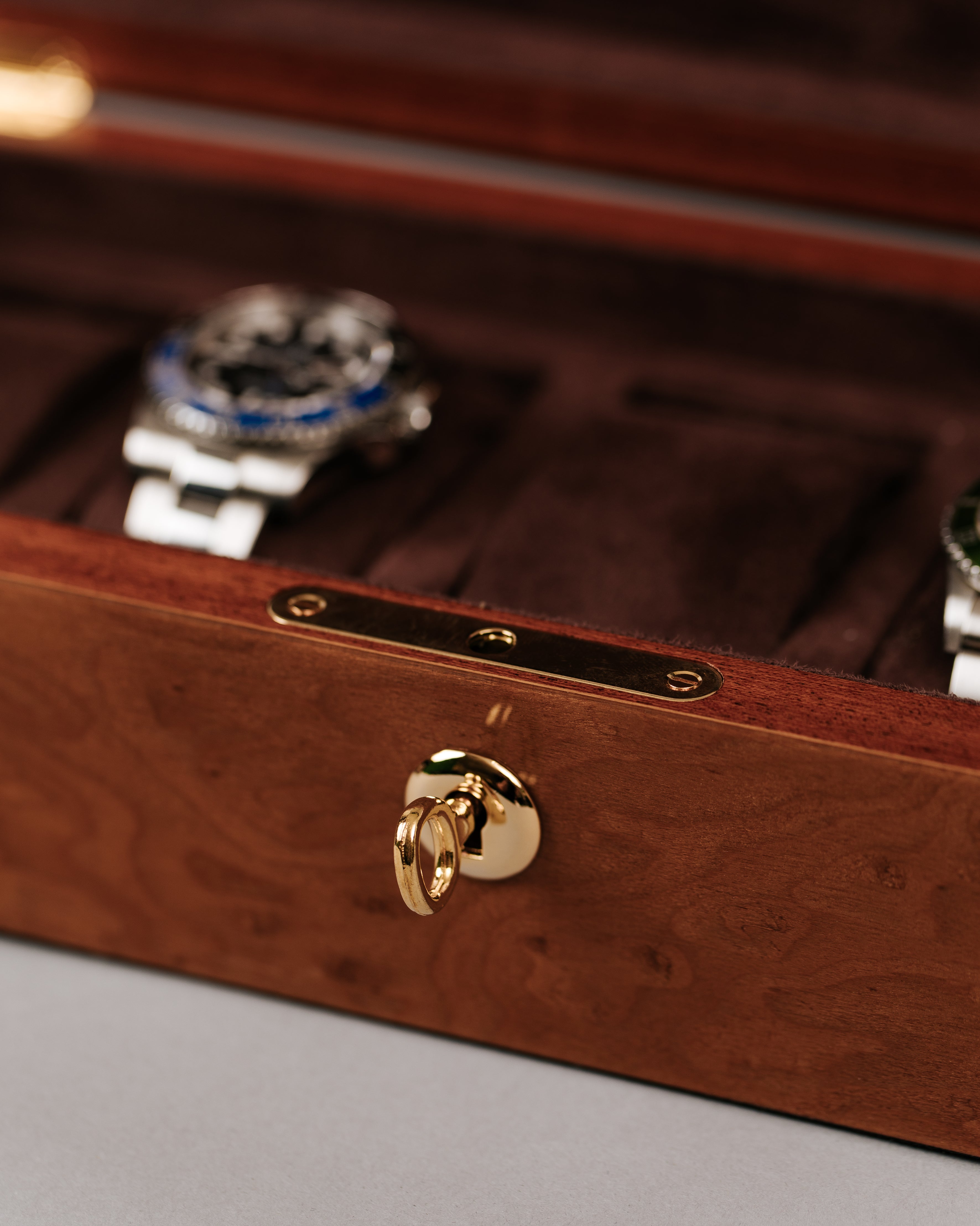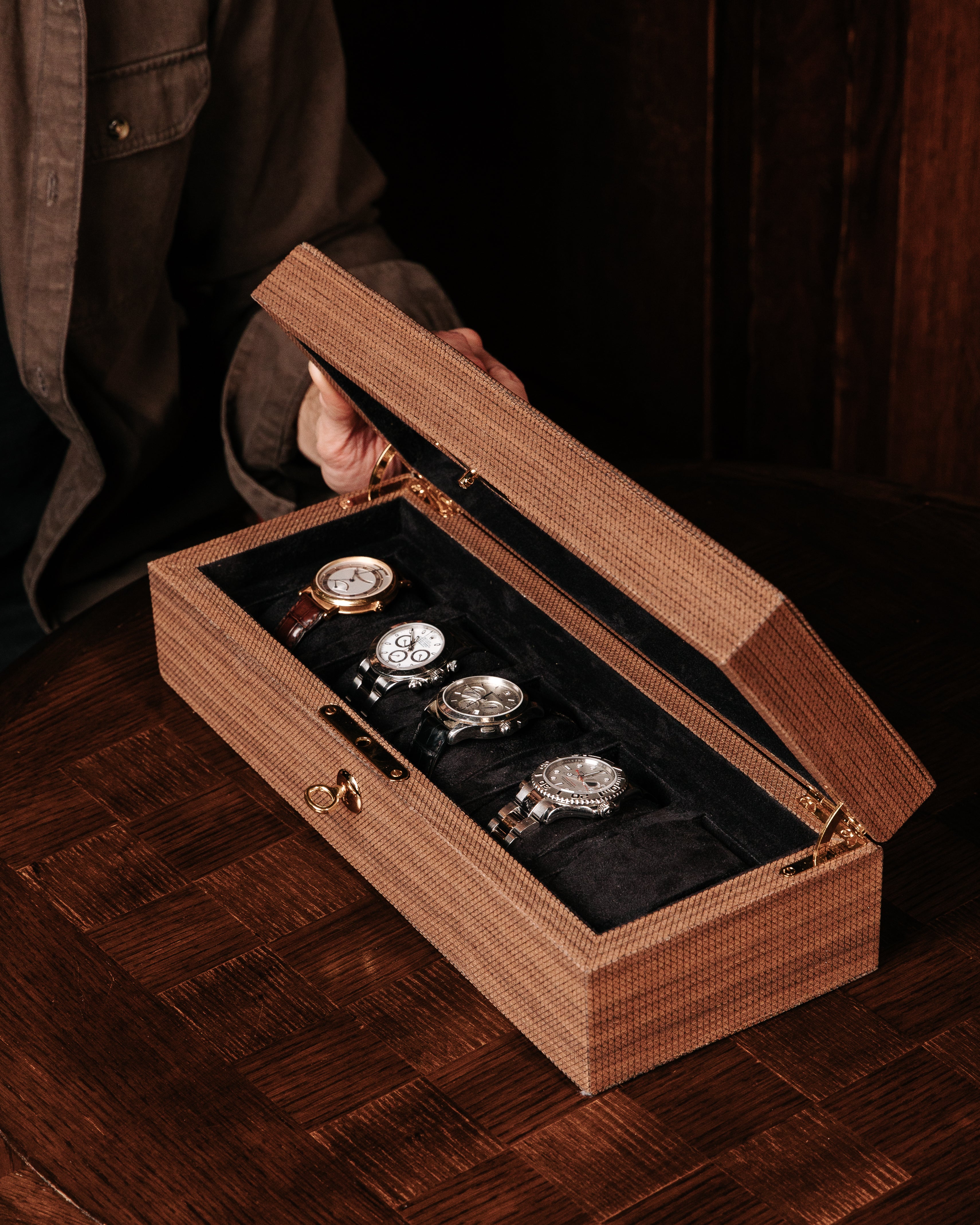 The Heritage Five watch box serves as the epitome of luxury, protecting and displaying five of your luxury time pieces. The materials are well-sourced, and the box is carefully handcrafted. What better way to elevate both your collection and your interiors?